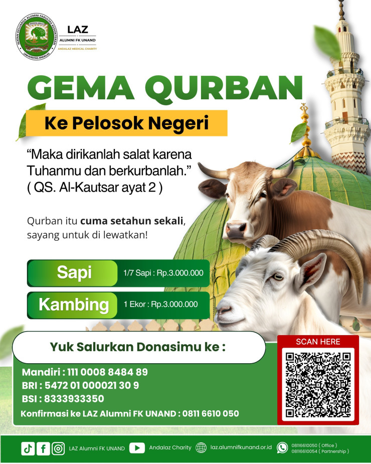 Qurban adalah momen setahun sekali untuk membuktikan rasa syukur dan kepedulian kita. Melalui LAZ Alumni FK UNAND, qurban Bapak/Ibu akan disalurkan langsung ke saudara-saudara kita di pelosok negeri yang jarang merasakan lezatnya daging qurban.