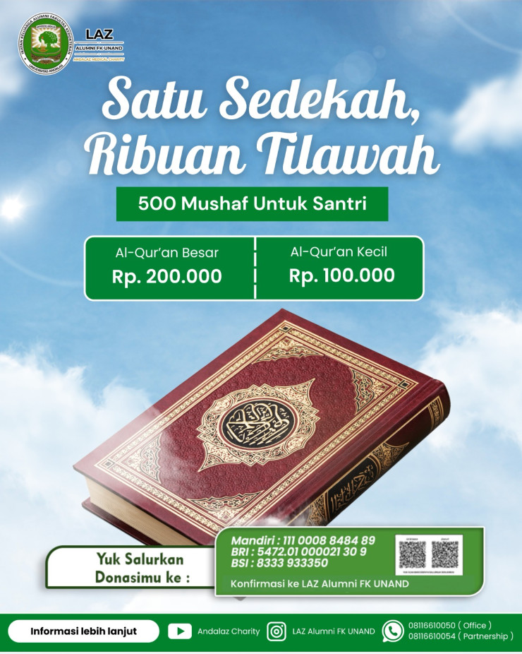 Bayangkan setiap huruf Al-Qur’an yang dibaca para santri, menjadi aliran pahala tanpa henti bagi kita semua. Melalui program 500 Mushaf untuk Santri, kita hadirkan cahaya ilmu dan iman di tangan mereka.