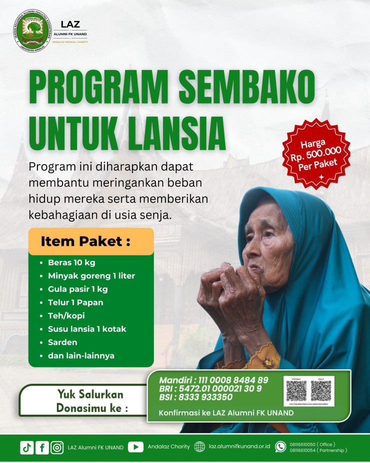 Melalui Program Sembako untuk Lansia, LAZ Alumni FK UNAND mengajak kita semua berbagi kebahagiaan dengan mereka.