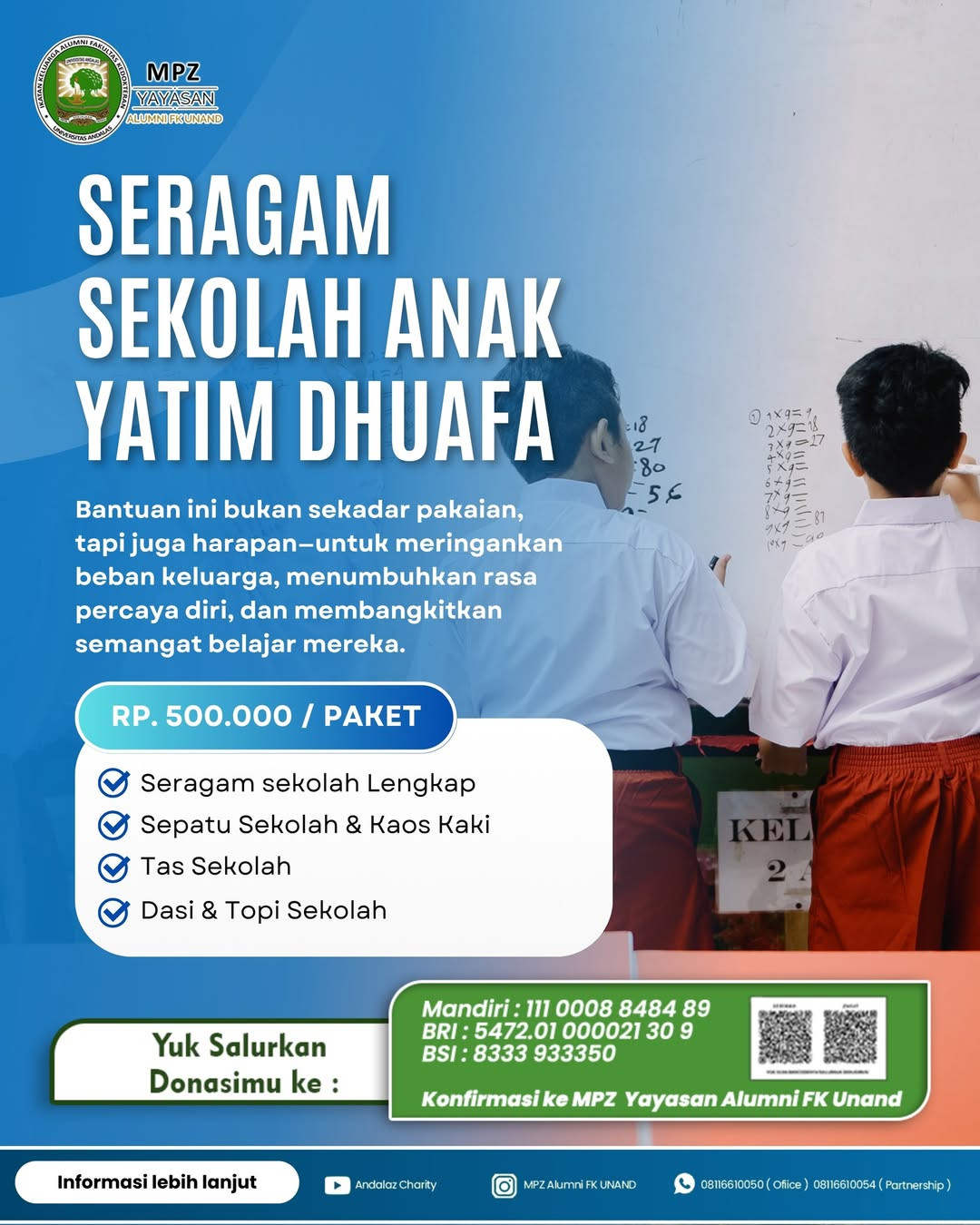 Melalui program ini, LAZ Alumni FK UNAND menghadirkan kepedulian nyata dengan memberikan seragam sekolah lengkap untuk anak-anak yatim dan dhuafa. Bantuan ini bukan sekadar pakaian, tapi juga harapan—untuk meringankan beban keluarga, menumbuhkan rasa percaya diri, dan membangkitkan semangat belajar mereka. Mari bersinergi, bersama donatur dan masyarakat, menciptakan masa depan yang lebih cerah bagi generasi penerus bangsa.